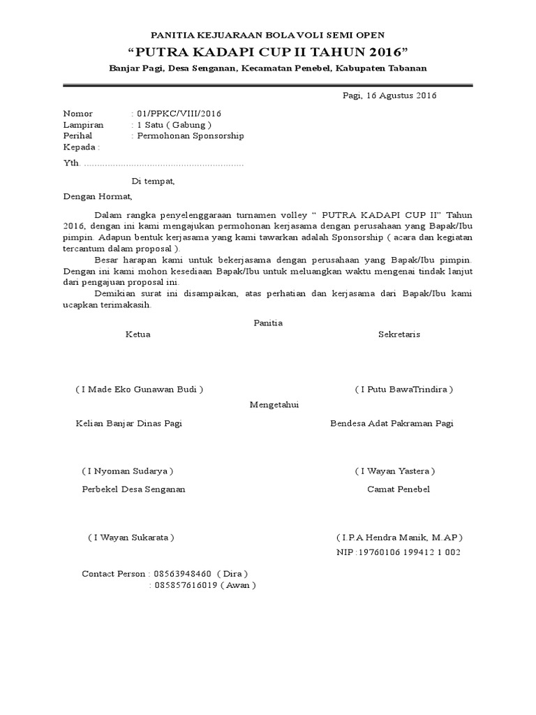 Lapangan Bola Gunungjati Kecamatan. Demikian surat permohonan sponsor ini kami sampaikan. HariTanggal Waktu Tempat.